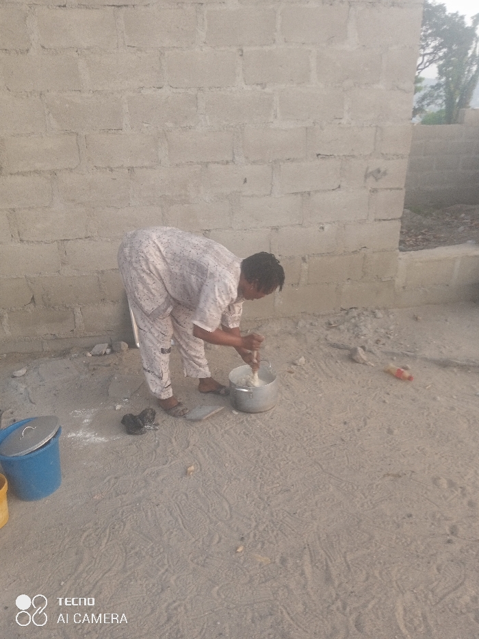 A woman wearing a patterned pajama set stirs a pot with a wooden utensil outdoors. She stands on a sandy surface near a partially constructed brick building. A blue bucket with a lid rests nearby, along with scattered debris like a discarded shoe. The light suggests it could be early morning or late afternoon.