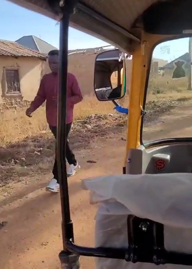 . The video is taken from inside a yellow auto rickshaw. The rickshaw is traveling on a dirt road. The driver, a young man wearing a black shirt and a silver chain, is visible from the back. There are buildings and vegetation on either side of the road. A person in white clothing is walking in the distance. The interior of the rickshaw is visible, including the windshield, side mirror, and a white sheet covering the seats.