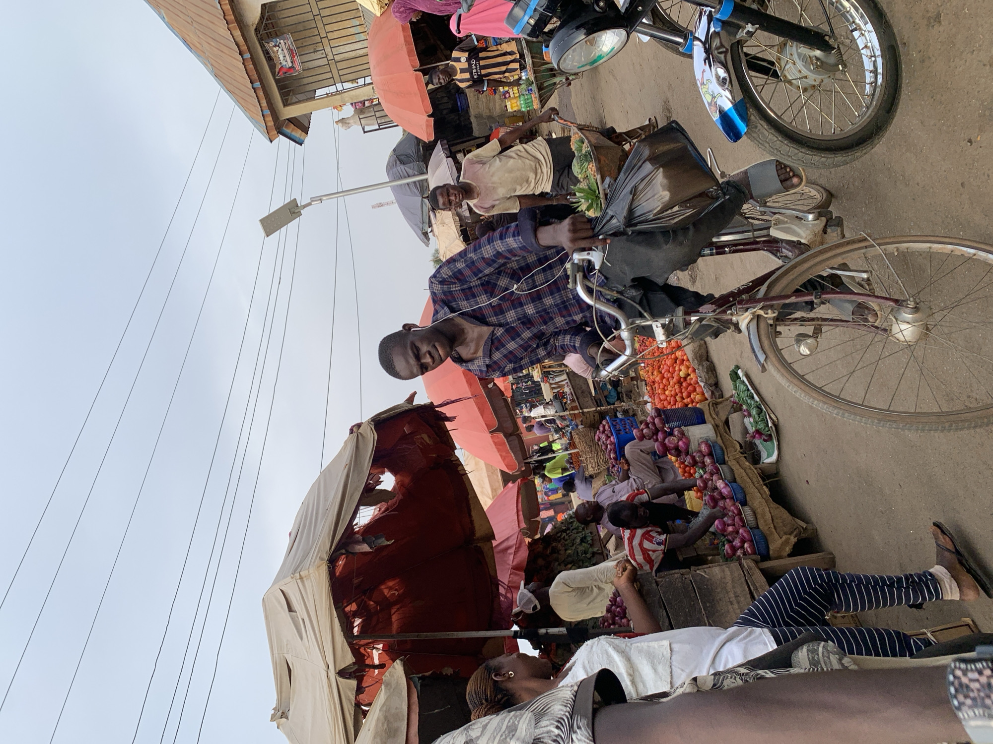 This image depicts a bustling outdoor market scene in Akwanga, Nigeria, under an overcast sky crisscrossed by multiple utility lines. In the central foreground, a male subject rides a dark-framed bicycle, wearing a plaid shirt, dark trousers, and sandals. He has wired earbuds in his ears and a black plastic bag hanging from his bicycle's handlebars. To his immediate right, the front wheel and chrome headlight of a blue-fendered motorcycle are partially visible. To the left of the cyclist, a female subject in a white top and striped leggings stands near a wooden market stall piled with red onions and tomatoes displayed in blue plastic basins and on mats. Behind her and extending into the mid-ground, a large, weathered, light-colored canvas canopy, torn in multiple places to reveal a red interior lining, shades a section of the market. Numerous other market stalls are visible throughout the scene, protected by various red and lighter-colored umbrellas and canopies. These stalls prominently display fresh produce, including abundant red onions, tomatoes, and leafy green vegetables. In the mid-ground, behind the central cyclist, another male subject pushes a wheelbarrow laden with produce, including distinct pineapples. He wears a light-colored t-shirt and dark shorts. Further into the background, several individuals are present, engaging in market activities; one male vendor in a red and white striped shirt is observed bending over a display of onions. On the far right, a building with a reddish corrugated metal roof and a barred window with a visible poster stands. A tall, silver street light pole with an LED fixture is centrally positioned in the mid-background. The ground throughout the market area appears to be unpaved or lightly paved dirt.
