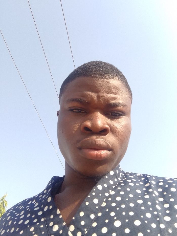 A close-up portrait shot depicts an adult male of African descent, centered and facing directly towards the camera. He has short, dark, textured hair and a neutral facial expression, with dark eyes and full lips. He is wearing a dark blue or black collared shirt adorned with white polka dots of varying sizes. The background is a clear, light blue sky, indicating an outdoor daytime setting. Three thin, dark lines, consistent with overhead utility wires, traverse the upper left portion of the sky. A small, out-of-focus green element, suggestive of foliage, is minimally visible along the far left edge of the frame. The scene is brightly illuminated by direct sunlight. The location is identified as the city of Zango-ndaji, Nigeria; however, no specific geographical landmarks are visually discernible within the image to corroborate this detail.