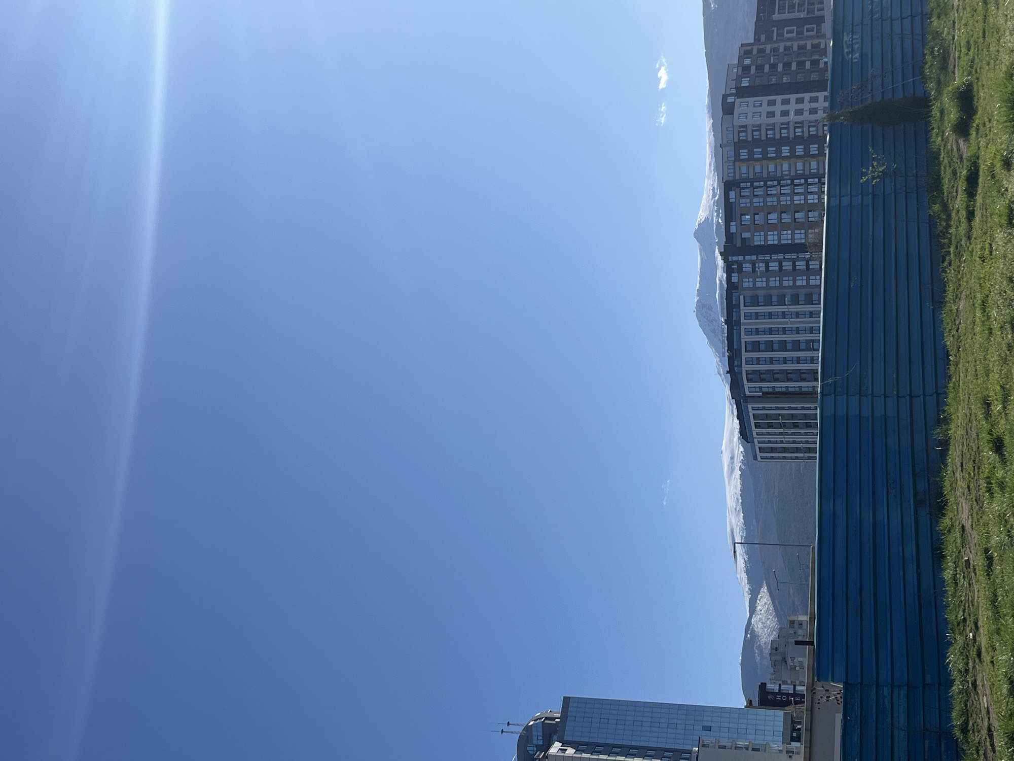 bright, sunny day in Sofia, Bulgaria, with a clear blue sky. Visible are several buildings, including a tall residential building with a facade of windows, and a glass-covered building adjacent to a patch of green grass. In the background, snow-covered mountains are partially visible, suggesting a mountainous landscape near the city.
