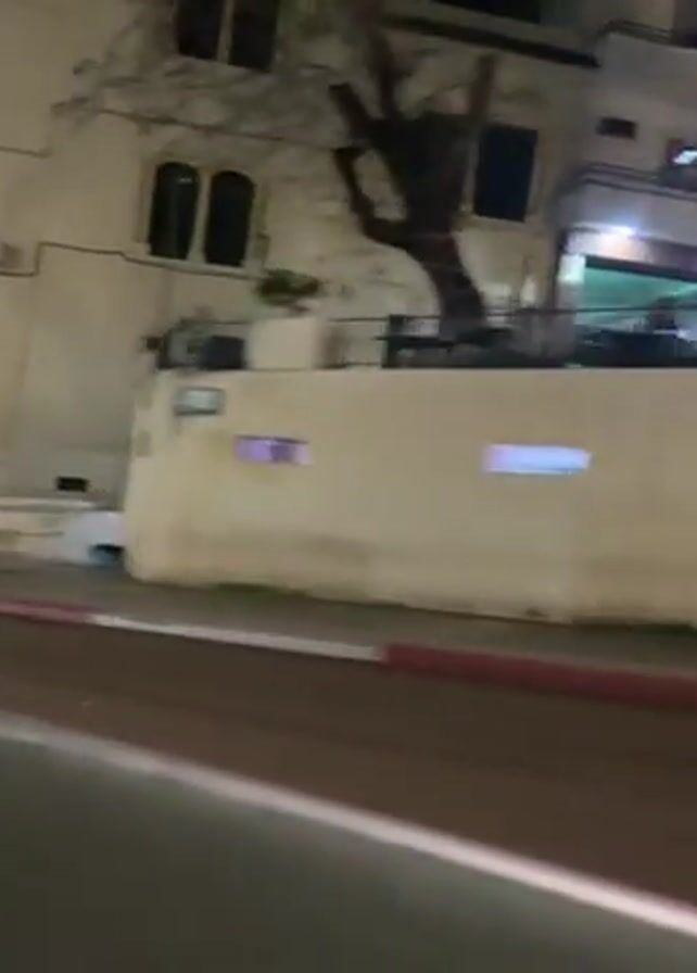 nighttime street scene from the perspective of a moving vehicle. The camera pans past buildings with lit windows and a wall with trees behind it. Cars are parked along the side of the street. People can be seen sitting or standing in front of the buildings. The road is paved and has a red and white curb.