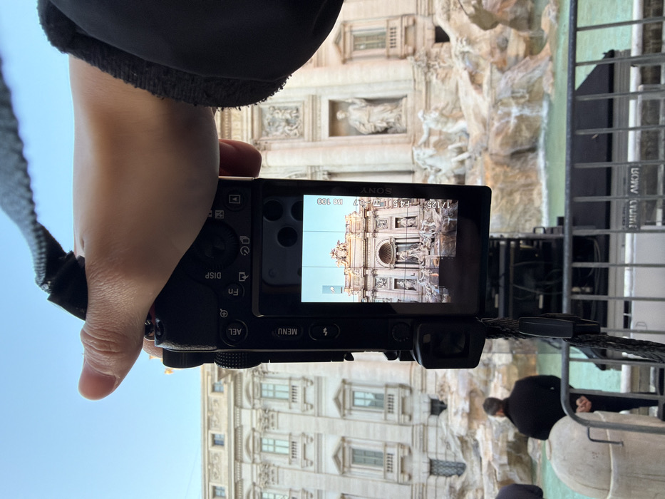 A person holds a Sony camera, taking a photo of the Trevi Fountain in Rome