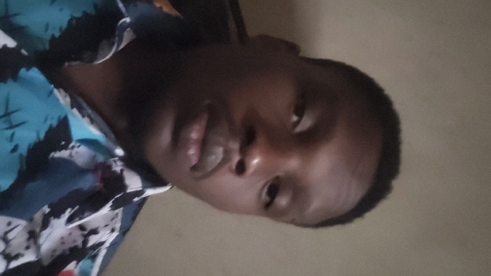 An adult male with a dark complexion, short dark hair, and a mustache is depicted in a close-up, head-and-shoulders portrait. He is looking directly forward, towards the camera, with a neutral expression. He is wearing a collared shirt featuring an abstract pattern of blue, black, and white/light grey. The background is a plain, solid light brown or beige wall, indicating an indoor setting. No other individuals or distinct objects are visible. The scene is located in the city of Badiko, Nigeria.