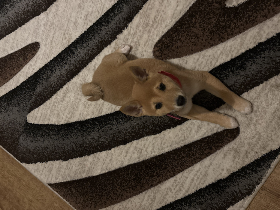 - "The image displays a light tan-colored canine, possibly a Shiba Inu puppy, lying centrally on a patterned rug" by FM-IJRNr1, licensed under CC BY 4.0