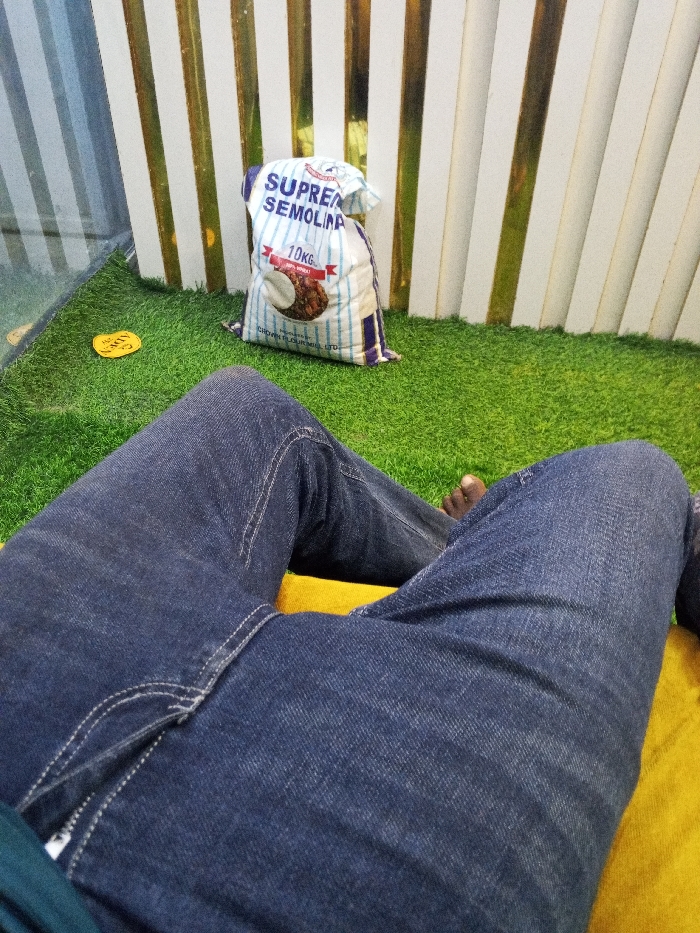 This image captures a partial view of an indoor or semi-enclosed area in Akwanga, Nigeria. The foreground shows the lower body of a person, seated or reclined, wearing dark blue denim jeans. A bare foot is visible between the knees, resting on a yellow upholstered surface that extends across the bottom of the frame. The floor directly in front of the person is covered with green artificial turf. In the mid-ground, a white 10KG bag of "SUPREME SEMOLINA" from Crown Flour Mills Ltd, featuring an image of semolina and grains, rests upright on the artificial turf. A small, irregularly shaped yellow object, possibly a sticker or label with faint black text, is also on the turf to the left of the semolina bag. The background consists of a vertical partition or wall composed of alternating white and golden-tan panels. A reflective surface, possibly glass, is visible on the far left.