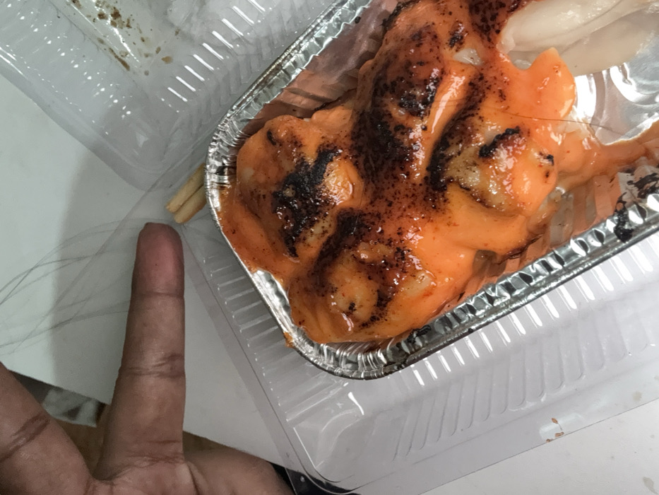 A human hand with medium-dark skin tone, primarily showing an extended index finger and part of the palm, occupies the upper left quadrant. The hand is positioned above a clear, ribbed plastic takeout container that holds a rectangular aluminum foil tray. Inside the foil tray is a food item, likely a baked sushi or mentai dish, generously covered with a vibrant orange, creamy sauce, which exhibits localized charring and dark specks from broiling or torching. A white base, possibly rice, is partially visible beneath the sauce on the right side of the tray. The hinged lid of the clear plastic container is open and rests to the upper right, displaying some brown crumbs or residue on its inner surface. Two light-colored, slender cylindrical objects, identified as chopsticks, are situated between the aluminum tray and the open plastic lid. Several thin, dark strands, consistent with human hair, are visible on the light-colored surface to the left of the hand, on the plastic container, and notably, one strand is partially embedded in the orange sauce of the food. The entire arrangement rests on a plain, light-colored surface. The scene is located in Bandung, Indonesia.