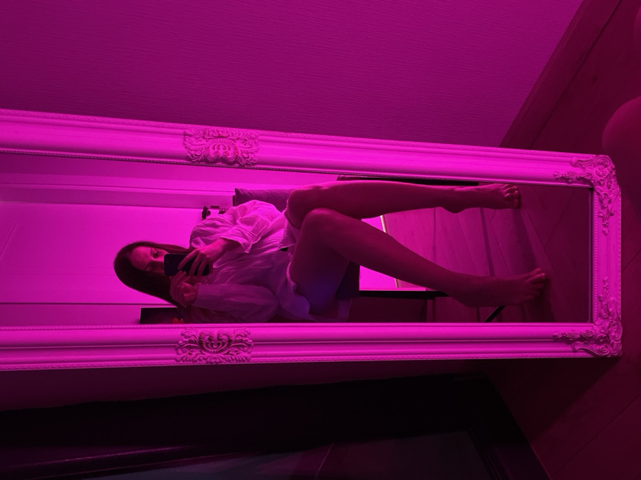 - "A person is reflected in a large, ornate, white-framed mirror under pink light" by FM-HSuMn2, licensed under CC BY 4.0