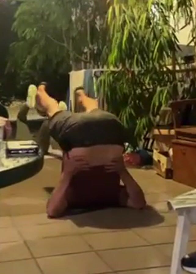 Here's a detailed description of the video: The video shows a man performing a yoga pose on a tiled patio. He's kneeling on the ground, bending forward so his torso rests on his knees, and his hands are supporting his back. His legs are extended upwards, so his body forms an inverted "V" shape. Other people sit around the patio at tables. One person is sitting at a green round table with a bottle of water, a glass, and a cell phone. Another person sits in a white chair. In the background is a plant, laundry hanging on a line, and other furniture. The scene appears to be shot in the evening under artificial lighting.