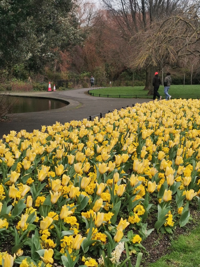 The image depicts a spring scene within St. Stephen's Green, Dublin, Ireland. In the foreground, a large flowerbed displays numerous bright yellow tulips intermixed with smaller yellow blossoms, likely primroses, and a small cluster of white hyacinths at the bottom right. Adjacent to this flowerbed, a dark grey paved pathway curves from the left towards the background. To the left of the path, a still, dark-water pond reflects the overcast sky. Two orange and white traffic cones are positioned near the pond's edge on the left side of the path. In the mid-ground, three individuals are present on the pathway. Two individuals walk together towards the background: the left person wears a dark jacket and a red beanie, while the right person wears a grey or olive-green jacket and blue jeans. Further along the path, a third individual, dressed in a grey hooded top, walks away from the viewer. Beyond the path, a manicured green lawn extends to a backdrop of various trees. Several large deciduous trees with bare branches are visible on the lawn, alongside denser foliage, including some evergreen trees and bare reddish-brown branches, forming the park's perimeter. The sky is uniformly light grey and overcast.