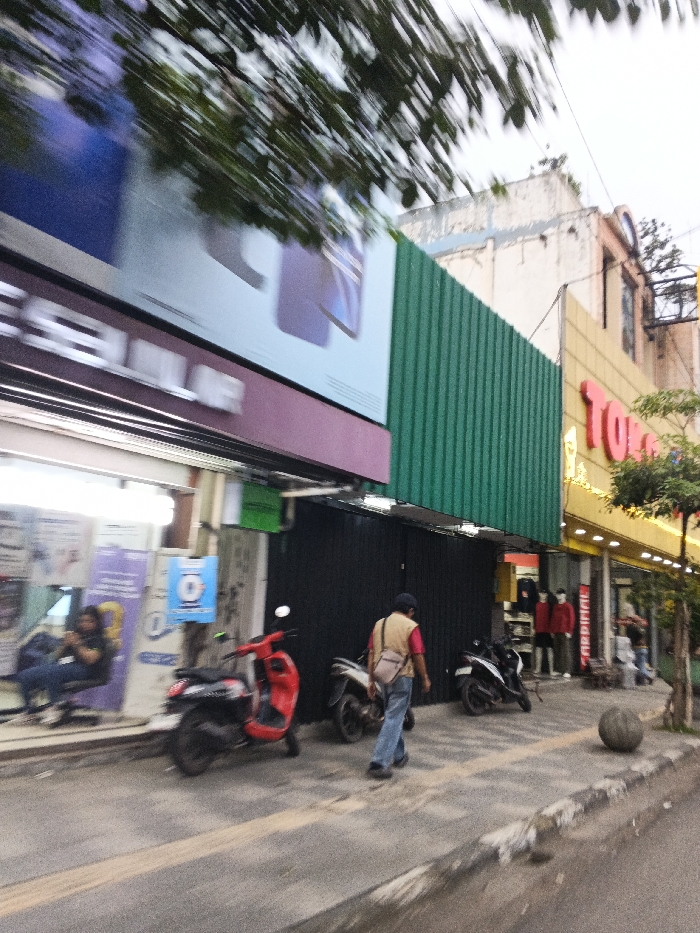 A commercial street scene in Bandung City, Indonesia, is depicted with a slight motion blur