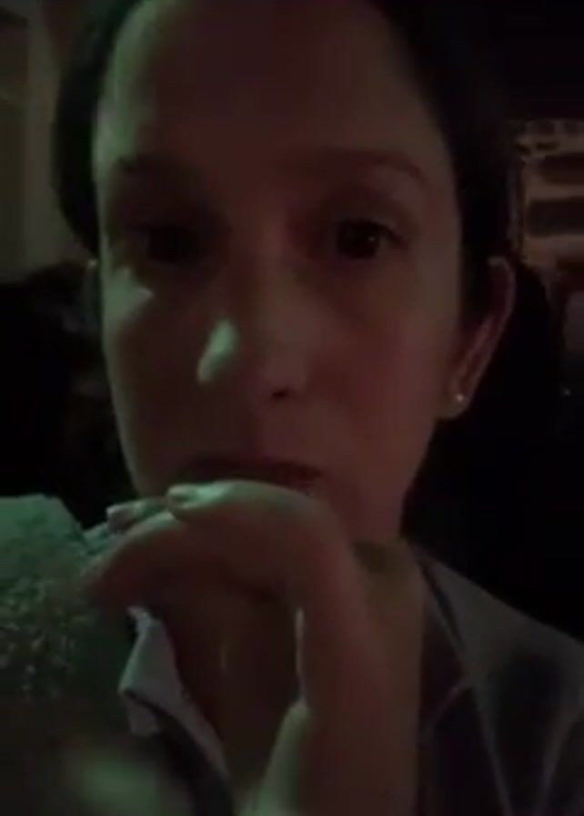 A woman with brown hair pulled back is seen in a dimly lit environment. She is wearing a light-colored shirt and a soft, textured jacket or sweater. The lighting is somewhat green-tinged. The woman is looking directly at the camera with a serious expression. Her hand is near her mouth, and she briefly moves it to show a ring on her finger. The background is dark, with indistinct shapes suggesting the presence of other people and perhaps an indoor setting, possibly a concert or performance venue due to the background noise of music.