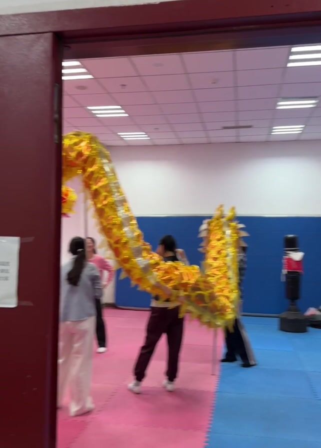A group of people are in a room with a large, shiny gold dragon. The room is divided into pink and blue floor mats. The dragon is being held up by several people with poles. Some people are watching. The room has white walls and a drop ceiling with fluorescent lights. There is a blue padded wall, a punching bag, and some personal items. The scene is viewed through a doorway with a maroon frame.