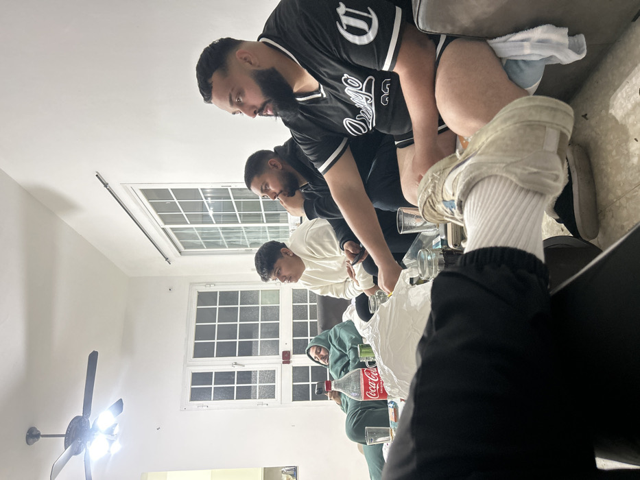 An indoor scene in Episkopi, Cyprus, depicts five individuals in a casual setting. The room features white walls, a ceiling fan with integrated lighting, and two multi-paned white-framed windows. A light-colored floor is visible. In the foreground, the lower body of an individual is partially visible, wearing black pants, white ribbed socks, and light-colored sneakers, with their right foot elevated. Directly behind this individual, a small table holds a 2-liter Coca-Cola bottle, multiple clear drinking glasses (some containing a dark liquid), a white plastic bag, and a clear jar with a dark substance. Four additional individuals are seated on a dark-colored sofa, generally facing towards the right side of the frame, suggesting they are observing something out of view. From left to right: 1. One individual reclines in a teal or dark green hooded sweatsuit, holding a smartphone and appearing to have a cigarette or vape pen in their mouth. 2. A second individual, with dark hair, wears a light-colored long-sleeved sweatshirt and looks intently to the right. 3. A third individual, with dark hair and a beard, wears a dark hooded sweatshirt, rests their chin on their hand, and also looks intently to the right. 4. The fourth individual, with a full beard and short hair, wears a black and white short-sleeved jersey with "Chicago" and a "C" logo. This individual sits with their legs exposed, one leg resting on the sofa with a white and blue towel placed beneath it, and is also looking intently to the right. The overall environment appears to be a living area or common room.