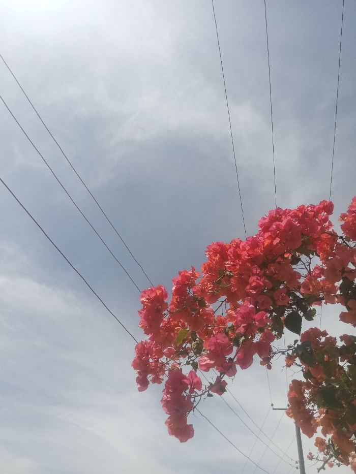 The image, captured in Jos, Nigeria, presents an upward-angled view of a bright, light blue sky featuring scattered thin white clouds and visible sunlight emanating from the upper left. Four primary parallel black utility wires traverse the upper two-thirds of the frame diagonally from the upper left to the mid-right. The lower right quadrant is dominated by a dense, vibrant mass of blooming bougainvillea, exhibiting shades of red and pink, intertwined with green foliage. A partial view of a utility pole, from which additional wires extend, is visible at the extreme bottom right, partially obscured by the bougainvillea. No human subjects or active interactions are depicted within the scene.