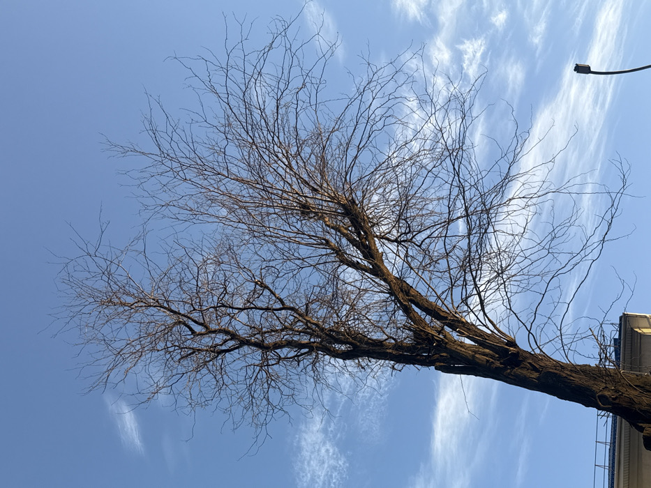 - "An upward-angled outdoor photograph depicts a large, leafless deciduous tree dominating the foreground against a clear blue sky with wispy white cirrus clouds" by FM-7X2N53, licensed under CC BY 4.0