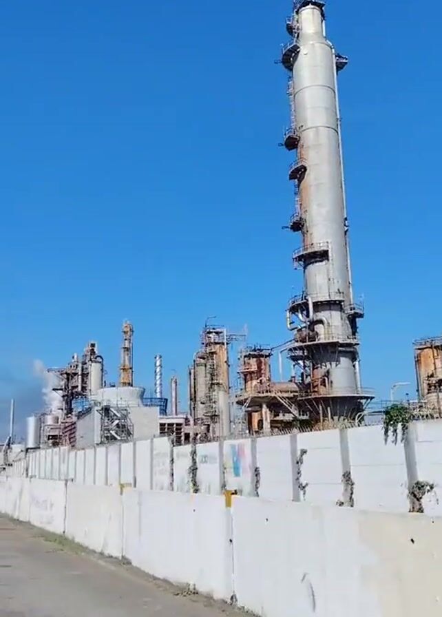 large industrial complex with a tall, cylindrical tower and several other structures, likely a refinery or chemical plant. The complex is surrounded by a white concrete wall with graffiti on it. Smoke or steam can be seen rising from some of the structures. The sky is clear and blue. The video is taken from a moving vehicle.