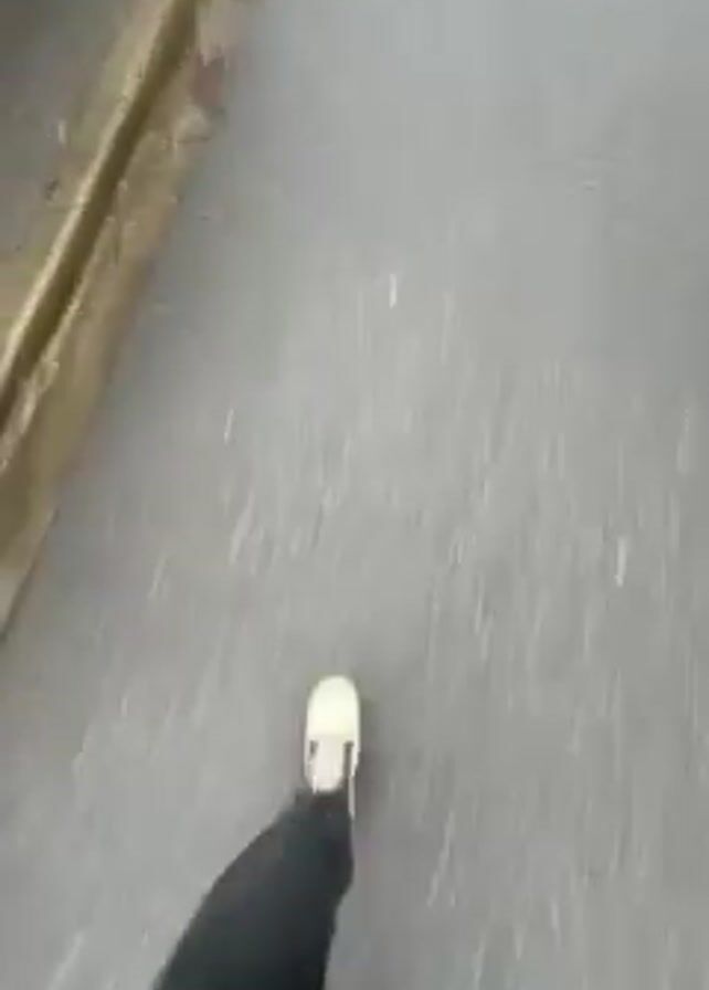 person walking on a gray asphalt road, filmed from a first-person perspective