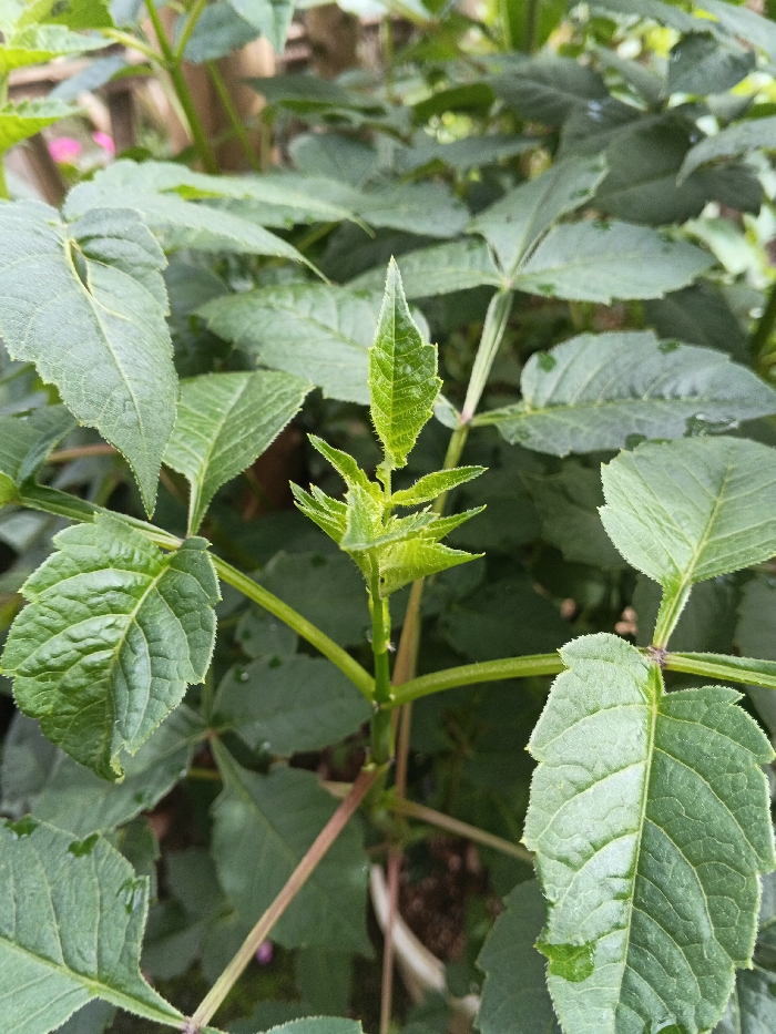 A close-up shot showcases lush green foliage. The leaves are serrated and textured with prominent veins. A central stem branches into several smaller stems, each bearing a cluster of leaves. The new growth at the top of the stem is a lighter green and appears delicate. Water droplets are visible on some of the leaves, indicating recent rain or watering. The image is well-lit, highlighting the intricate details of the plant.