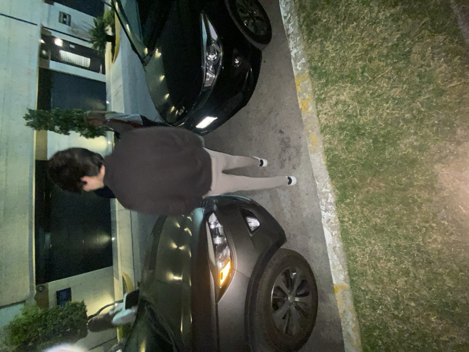 A person is standing between two parked cars, a black one and a gray one. The person wears a dark gray sweatshirt, gray pants, and white shoes. The cars are parked on a paved area with grass nearby. A building is visible in the background. The lighting suggests it is nighttime.