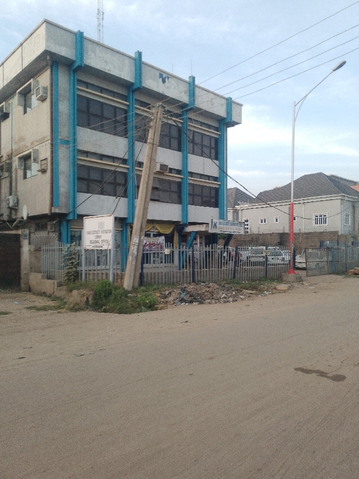 A three-story building with blue accents stands next to a concrete utility pole. Signage indicates the "IKANO ELECTRICITY DISTRIBUTION COMPANY REGIONAL OFFICE". A fence separates the building from a street with scattered litter. In the background, a light gray residential building is visible. Overhead wires crisscross the sky. The photo is taken from a low angle on a somewhat cloudy day.