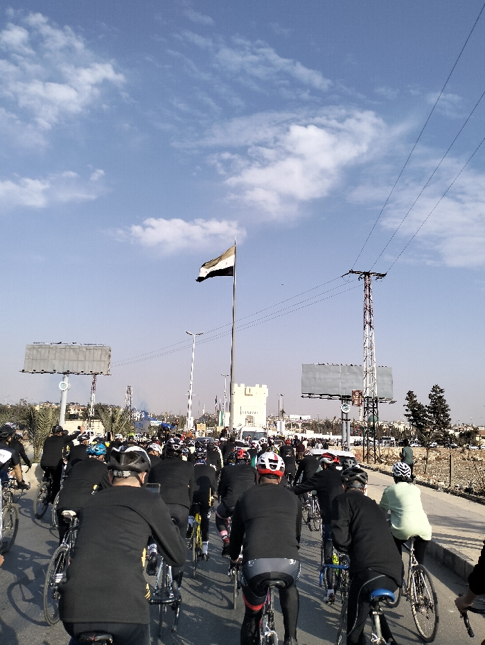 A large group of cyclists rides on a road beneath a bright sky with scattered clouds. Most cyclists wear dark clothing and helmets, while a few wear lighter colors. An Egyptian flag flies on a tall pole near a light-colored building. Power lines and poles stretch across the sky. Billboards and trees line the road. The scene appears to be a planned cycling event.
