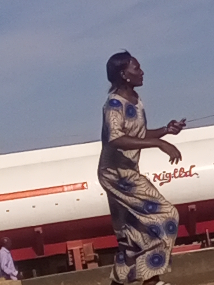 The image depicts an outdoor scene at Yakubu Gowon Airport in Jos, Nigeria, under a clear blue sky. A dark-skinned woman is prominently featured in profile, positioned mid-frame, appearing to walk towards the right. She wears a long, patterned dress characterized by multiple blue circular motifs on a light beige or off-white fabric. Her hair is short and dark, and she wears a light-colored earring on her visible ear. Her right hand is raised, holding a small, light-colored object, consistent with a mobile phone. In the background, behind the woman, a large white aircraft fuselage is visible, featuring a distinct horizontal red stripe along its lower section. Red script text, partially obscured but appearing to read "NigLId" or "NigFed," is emblazoned on the white fuselage. The lower left portion of the image reveals a partially visible male figure, seated on a low structure, wearing a light purple long-sleeved shirt. The ground in the foreground and beneath the aircraft is a dark, indistinct surface, likely tarmac, with some red structures visible between the seated man and the aircraft.