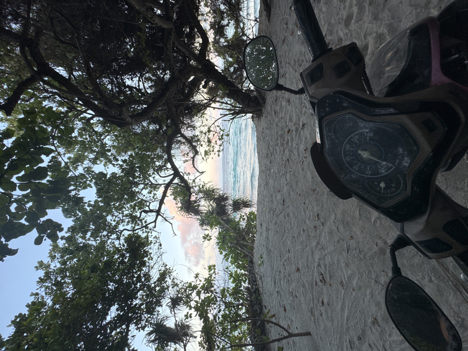 This image depicts a beach scene in Ukulhas, Maldives. The foreground is dominated by the front section of a dark-colored scooter, parked directly on light-colored sand. The scooter's dusty dashboard is visible, displaying a speedometer with the needle at zero and a maximum reading of 140 km/h, along with a fuel gauge and other indicator lights. A rearview mirror is visible on the right handlebar, reflecting foliage, and a portion of another mirror is on the left. Beyond the scooter, a expanse of granular, light-colored sand extends towards the ocean. The mid-ground features the tranquil, turquoise waters of the ocean with gentle waves lapping at the shoreline. A narrow strip of low-lying green vegetation and scattered rocks or coral fragments borders the sand at the water's edge. The background reveals a light blue sky transitioning to a band of soft pink and white clouds horizontally near the horizon, indicative of either sunrise or sunset. Dense tropical foliage, including large-leafed trees and shrubs, frames the upper and side portions of the scene, creating a natural canopy. Several branches are adorned with epiphytic plants or air plants. No individuals are present in the scene.