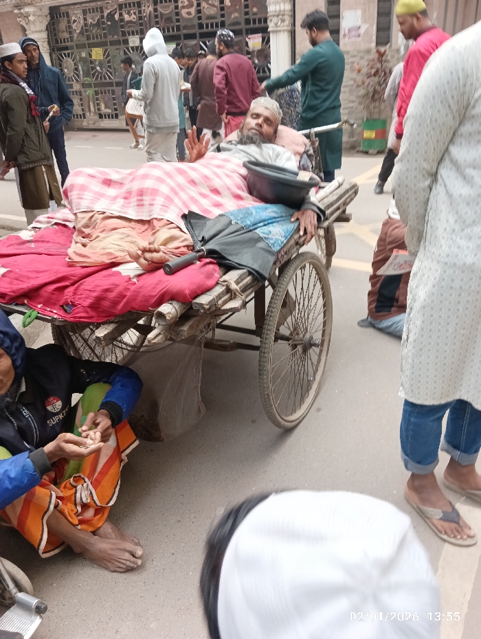 The image captures a crowded street scene in Dhaka, Bangladesh, dated 02/01/2026 at 13:55. In the center, an adult male with a beard and light-colored cap lies on his back on a rustic wooden handcart, covered by a red and white checkered blanket and other fabrics. His right hand is raised, and a black collection bowl rests on his chest. A folded black umbrella lies next to him on the cart. In the foreground, a barefoot man sits on the asphalt ground to the left, wearing a blue jacket and an orange and white striped lungi, holding small items in his cupped hands. To the right, the lower torso of a person in a light tunic, blue jeans, and flip-flops is partially visible, standing near the cart. The background features a group of men standing and walking near a building with an ornate metal gate, indicating a busy public area.