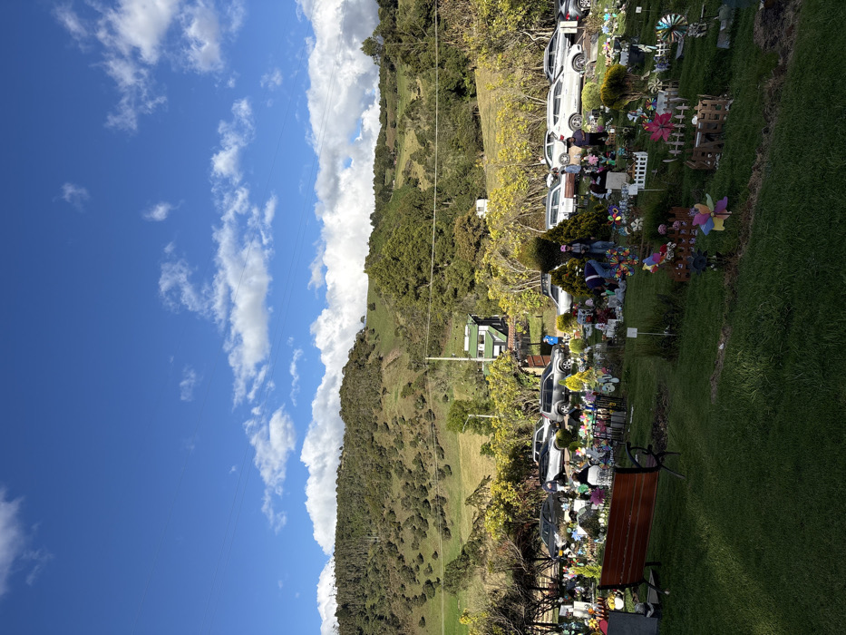 The image displays an outdoor memorial park or cemetery situated within a hilly, vegetated landscape, specific to Casco Urbano, Colombia. The sky is clear blue with scattered white cumulus clouds, indicating bright daylight conditions. The foreground presents a well-maintained grassy expanse dotted with numerous gravesites. Each grave is individually adorned with an assortment of colorful artificial and natural flowers, vibrant pinwheels (blue, yellow, pink, green), small white picket fences, and various commemorative objects. A dark brown wooden park bench with black metal supports is visible on the left side of the foreground. In the midground, approximately 15 to 20 individuals are present, distributed among the graves and near a line of at least eight parked passenger vehicles, predominantly light-colored SUVs and sedans, on an unpaved lot. Individuals are observed standing, walking, and bending over grave markers, consistent with memorial visits or grave maintenance. One person in the center-right is actively tending to a grave. The area is populated with trees and shrubs, some exhibiting yellow blossoms. The background is dominated by rolling green hills, densely covered with varied vegetation, including trees and grass. A small, multi-story green building with a red roof and a smaller white structure are nestled into the lower slopes of these distant hills. Multiple power lines are visible horizontally across the mid-upper portion of the background. The scene depicts a serene, visited memorial ground set against a natural, mountainous backdrop.