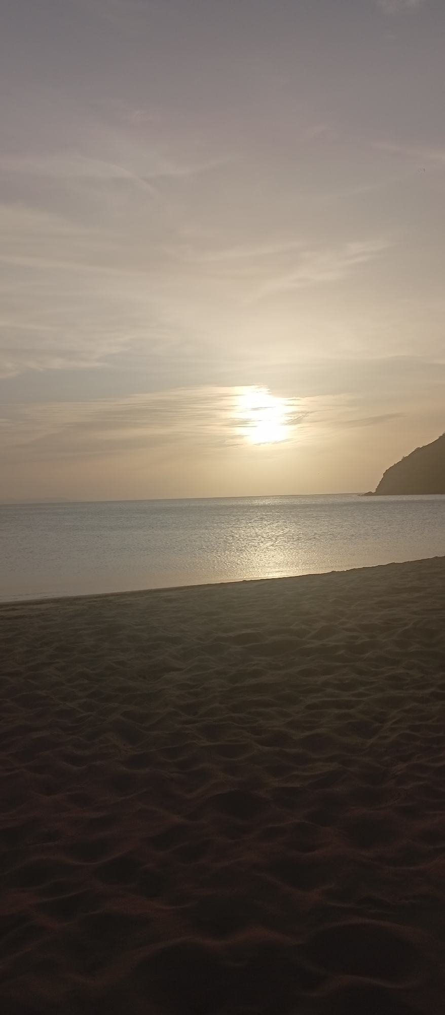 The image depicts a coastal scene at sunset, likely in or near Juan Griego, Venezuela. In the foreground, dark sand with rippled patterns fills the lower half of the frame. Moving towards the horizon, there's a calm sea reflecting the setting sun, causing a bright horizontal streak. A land mass, possibly a peninsula or headland, is visible on the right side of the frame. The sky is muted with soft clouds, illuminated by the sun. There are no people or other obvious subjects present.