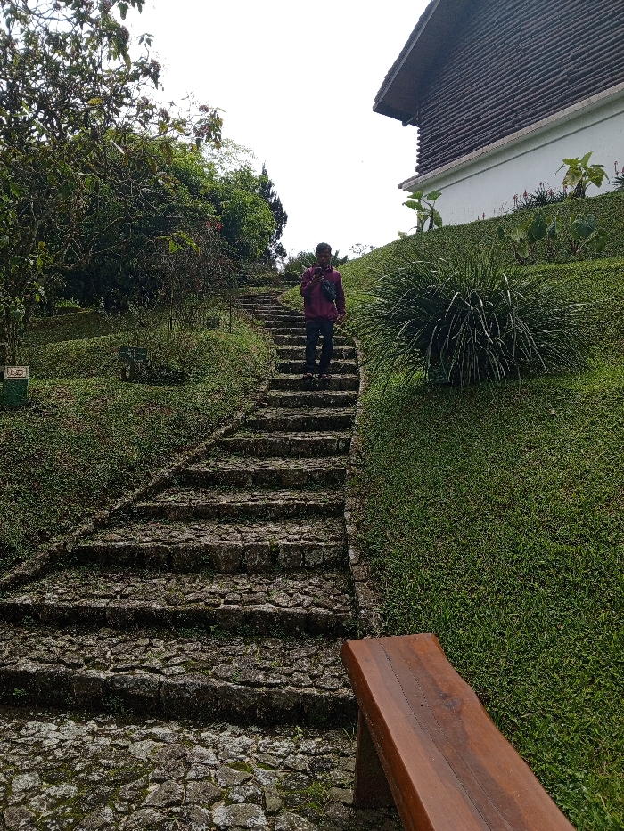 The image displays an outdoor, landscaped hillside environment, characteristic of the Bà Nà Hills area in Đà Nẵng, Vietnam. A single individual is depicted descending a rustic, uneven stone staircase that progresses uphill from the foreground. The person wears a dark red jacket, dark trousers, and open-toed footwear, and carries a dark sling bag across their chest. Both hands are engaged with a smartphone, which the individual is looking down at. The staircase is flanked by steep, grass-covered slopes. On the left slope, various trees and bushes are present, along with a partially visible green and white sign. On the right slope, a large clump of ornamental grass is visible. In the upper right background, a portion of a building with a dark, textured roof and a white lower wall is present on the elevated terrain. A segment of a dark brown wooden bench occupies the lower right foreground. The sky is overcast.