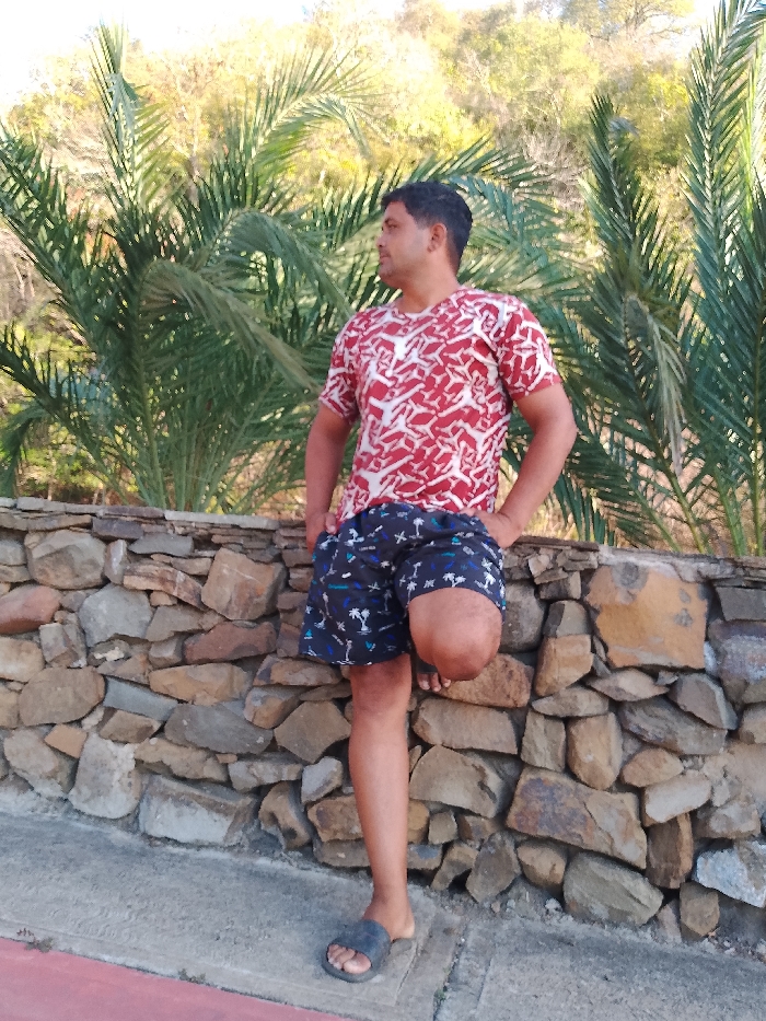 An adult male stands outdoors in Tacarigua, Venezuela, leaning against a low stone wall composed of irregularly shaped, light brown and gray rocks. He is positioned facing slightly to his left, with his head turned to his right, looking off-camera. He wears a short-sleeved, V-neck t-shirt with a red base and a white abstract pattern, and dark blue shorts featuring light-colored patterns of palm trees and other elements. His hands are placed on his hips. The male's right leg is amputated above the knee, with the residual limb resting on the top of the stone wall. His left leg is extended, wearing a dark gray slide sandal on his foot, which is placed on a gray concrete surface bordered by a reddish strip on the left. Behind the wall, dense green foliage, primarily large-leafed palm trees and other lighter green vegetation, forms the background. The lighting suggests daylight conditions.