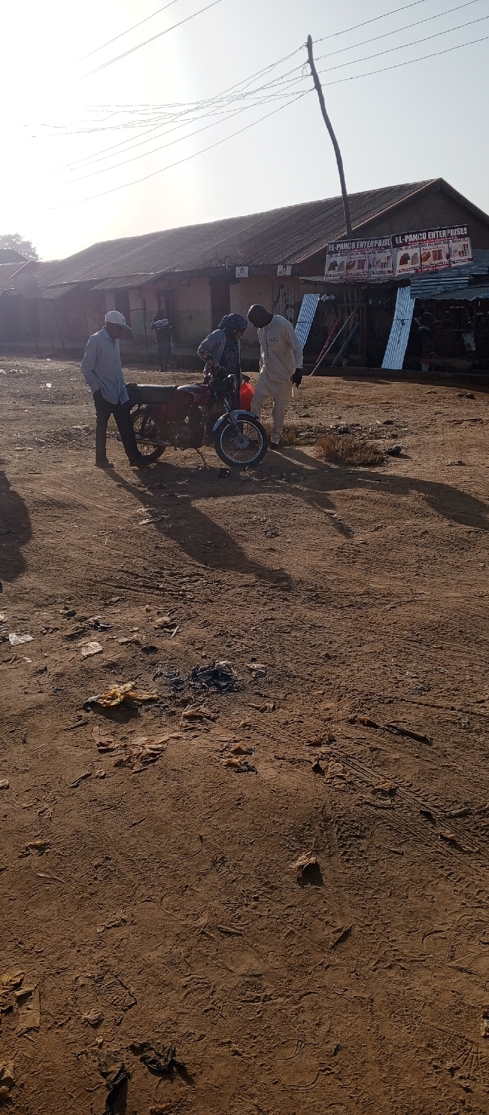 Three people are gathered around a red motorbike in a dusty, open area. The ground is brown and scattered with debris. Behind them, a long, low building with corrugated metal sections and signs for "EL-PANCO ENTERPRISE" is visible. An overhead powerline pole is located to the right of the building. The light suggests it's either early morning or late afternoon.
