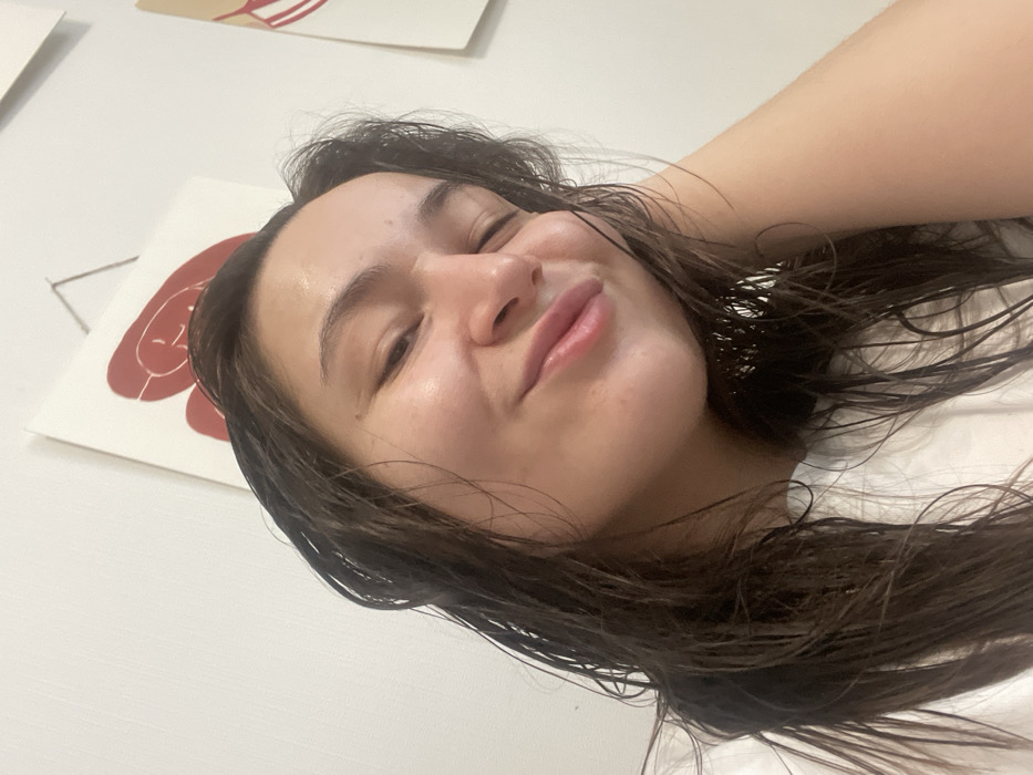 - "A close-up selfie shows a young woman with dark, wet hair" by FM-igmhG3, licensed under CC BY 4.0