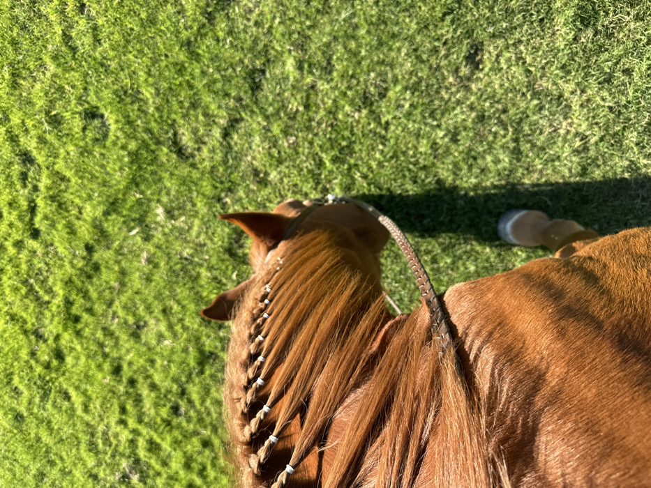 - "A reddish-brown horse with a braided mane stands on green grass" by FM-KbS6O2, licensed under CC BY 4.0