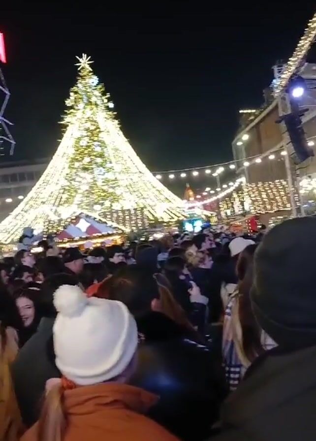 large crowd of people at an outdoor Christmas market. The crowd is dense and people are moving around. In the background, there is a large Christmas tree decorated with lights, and a building with a decorative light display. The environment appears to be at night. The video is handheld and somewhat shaky.