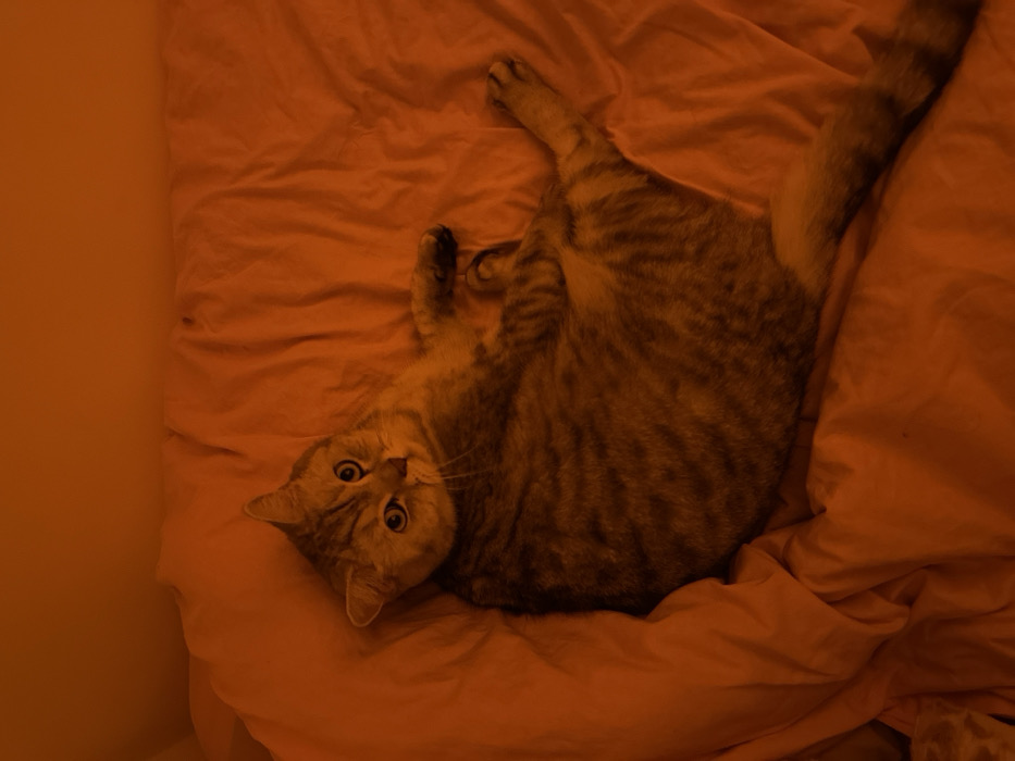 - "A domestic cat is depicted lying supine on an orange-colored bedsheet or duvet, positioned at an angle from the upper left to the lower right of the frame" by FM-IgLYH3, licensed under CC BY 4.0