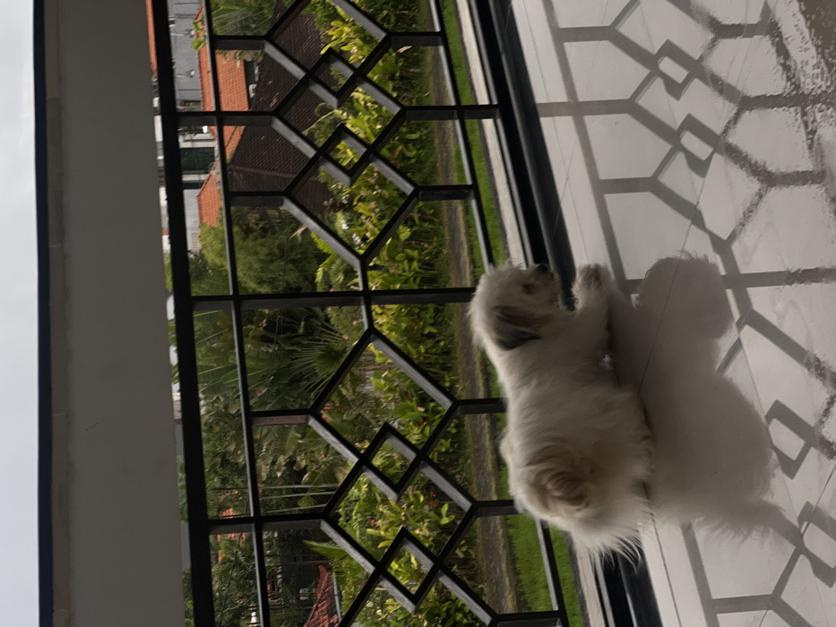A small, predominantly white, shaggy-haired dog with light brown patches on its hindquarters and around its ears, lies on a light-colored, reflective tiled balcony floor