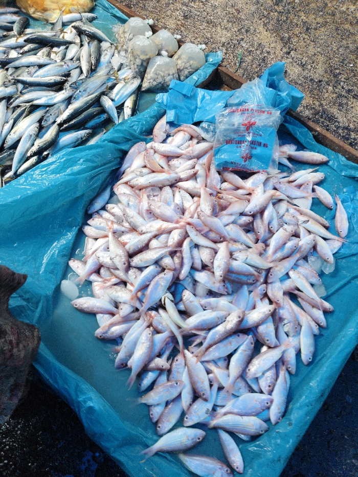A variety of fish is displayed for sale. Darker, silver-colored fish are piled on the left, while smaller, light pink fish fill a blue tarp in the center. Several bags of unknown contents are situated between the two types of fish. A plastic bag with red writing is on top of the pink fish. The background consists of a rough, gray surface.
