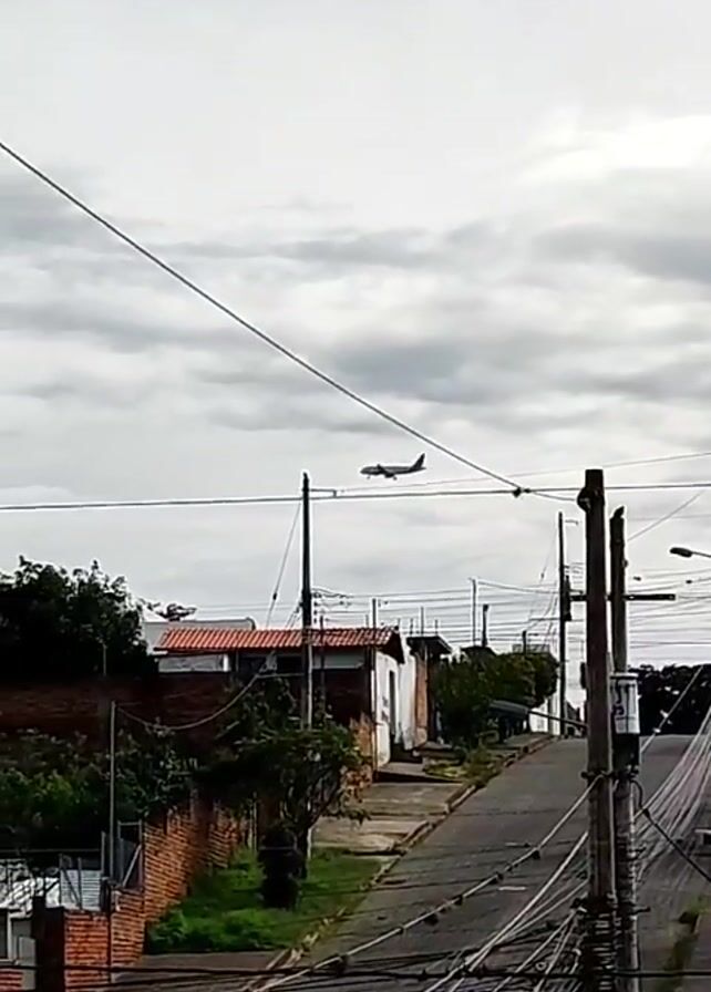 The video begins with a view of a street bordered by small buildings under a cloudy sky, with a plane flying overhead