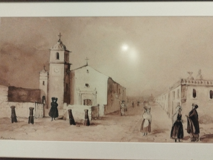 The sepia-toned picture shows a quaint, quiet street scene. A church with a bell tower and cross dominates the left. Several people stroll along the dusty road. Two women and a man are conversing near the right side of the image. The buildings lining the street are simple, with flat roofs and minimal ornamentation. The scene has an old-world charm. The sky is overcast or hazy, lending a somber atmosphere. Cannons act as bollards in front of a fence.