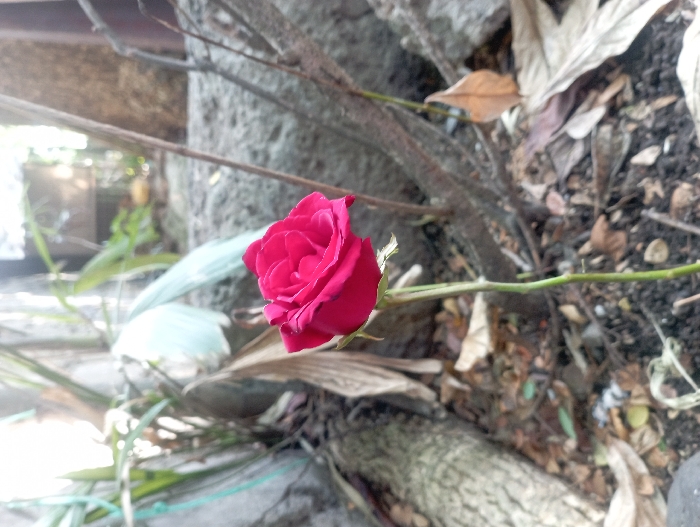 single, vibrant red rose in full bloom, growing amidst brown, dry leaves and twigs in a patch of dirt
