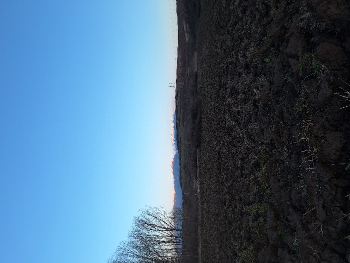 The image displays a rural landscape in Panicharevo, Bulgaria, observed under a clear blue sky, likely during dawn or dusk. The immediate foreground consists of a large, dark-brown expanse of freshly tilled or disturbed earth, appearing as distinct clods of soil with sparse, dry vegetative remnants interspersed. To the left, a line of deciduous trees, devoid of leaves, presents a dark silhouette against the brightening horizon. The midground reveals a undulating terrain of low hills covered in sparse, dark vegetation, beyond the cultivated field. Towards the right side of the midground, several slender, dark vertical structures, consistent with utility poles or communication masts, rise against the distant backdrop. The far background is dominated by a prominent range of snow-capped mountains, stretching horizontally across the horizon, with their white peaks subtly illuminated. The sky occupies the upper portion of the frame, exhibiting a clear, unblemished blue color that gradually lightens towards the horizon. No individuals, animals, or explicit activities are discernible within the scene.