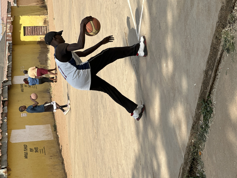 An outdoor scene in Jos, Nigeria, depicts an informal basketball court