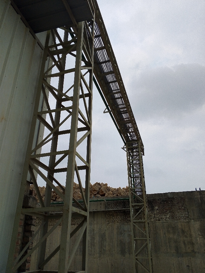 close-up view of a large metal structure located at 22.694, 90.601 in Pangasia, Bangladesh. The structure is composed of two large vertical beams connected by horizontal beams, creating a lattice-like pattern. The structure appears to be a support for a long metal pipe system that runs above the beams, with the pipe system supported by a series of cross beams. There is a section of a white, corrugated metal wall behind the structure, with a portion of a brick wall visible in the distance. The sky is overcast.