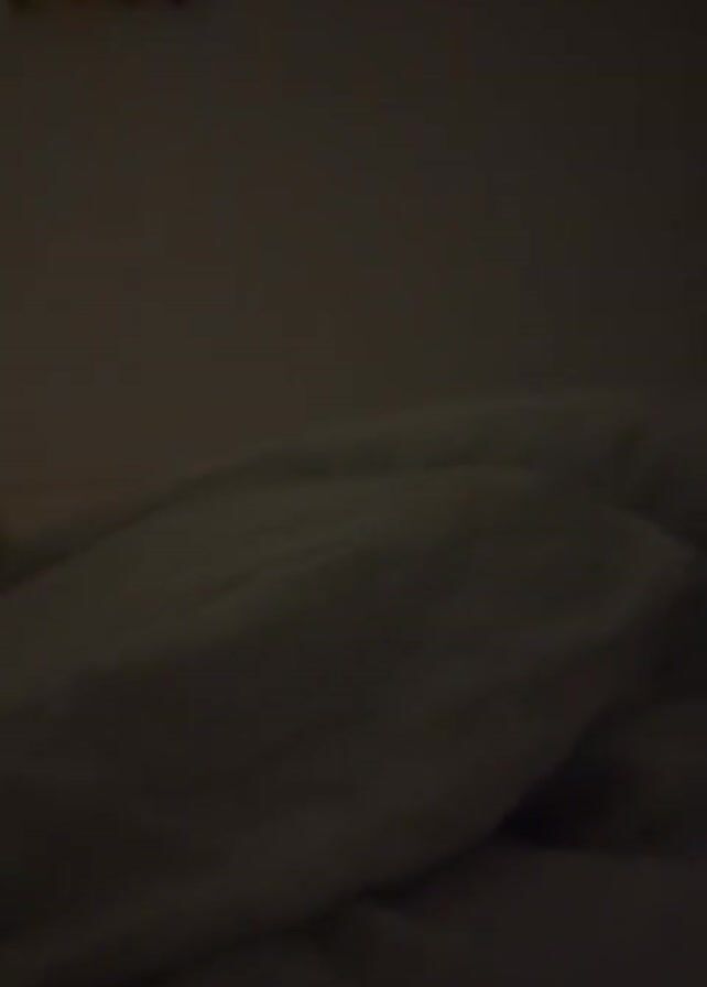 low-lit room. In the foreground are white bed sheets. In the background is a wall with a blurry image or picture and a string of small, unfocused lights along the top of the wall. There is a sound of speech.