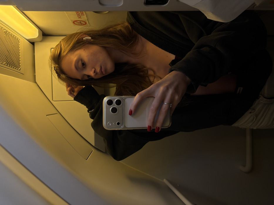 A female subject is depicted inside an aircraft cabin, consistent with a commercial airliner currently located in Sepang, Malaysia, likely at Kuala Lumpur International Airport. The interior features warm, artificial yellow-orange lighting, a curved ceiling, and overhead compartment details including a latch and ventilation panel. A reversed "NO SMOKING" pictogram sign is partially visible on the right side. A white grab bar or handle is affixed to the left cabin wall. The subject, appearing to be in her twenties or thirties, has long, light brown hair, which she touches with her left hand, revealing a silver ring on her left ring finger. She wears a dark, unzipped hooded sweatshirt over a dark undergarment and light-colored pants. Her right hand holds a silver smartphone, equipped with a clear protective case and a triple-lens camera system, angled to capture a mirror selfie. Her fingernails are painted red, and a silver ring is present on her right ring finger. A white wireless earbud is visible in her right ear. She maintains a neutral expression, gazing towards the phone's display.