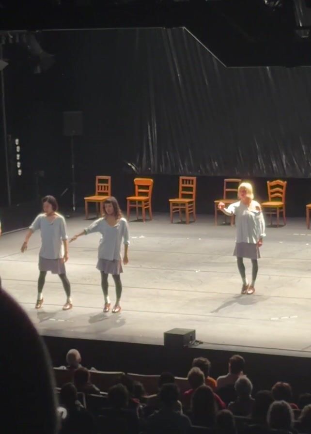 Three performers are on a stage in front of an audience. They are all wearing matching costumes: light blue oversized shirts, gray skirts, black tights, and brown shoes. The stage is simple with a black backdrop and several orange wooden chairs placed across it. The performers are moving in unison, possibly dancing, with synchronized arm movements. The camera angle is from the audience, showing the back of heads and shoulders in the foreground. The lighting on stage is bright, focusing on the performers.