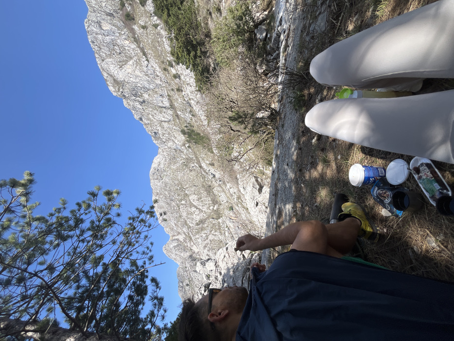 The image depicts an outdoor scene in Žanjev Do, Montenegro, under a clear blue sky. Two individuals are resting on the ground. One individual, a male, is visible from the mid-back and right side, wearing sunglasses, a dark blue hooded sleeveless top, and yellow athletic shoes. He is seated on dry ground covered with pine needles, with his right hand near his mouth, holding a small item. Beside him and towards the foreground, an assortment of items is laid out on the ground: a dark insulated bottle, a white plastic container with a blue label, a dark-colored food packet, two small dark cups, and a plastic tray holding pastries. The legs of a second individual, wearing light-colored pants or leggings and light-colored shoes, are visible in the right foreground, extended towards the items. A clear plastic bottle with a green cap is positioned near their legs. The background features steep, rugged, light-colored mountains under a bright sun, with sparse vegetation, including evergreen pines and deciduous trees and bushes. A deep valley or gorge is visible below the immediate resting area, indicating a high vantage point. A large pine tree partially obscures the upper left portion of the frame, providing shade over the foreground.